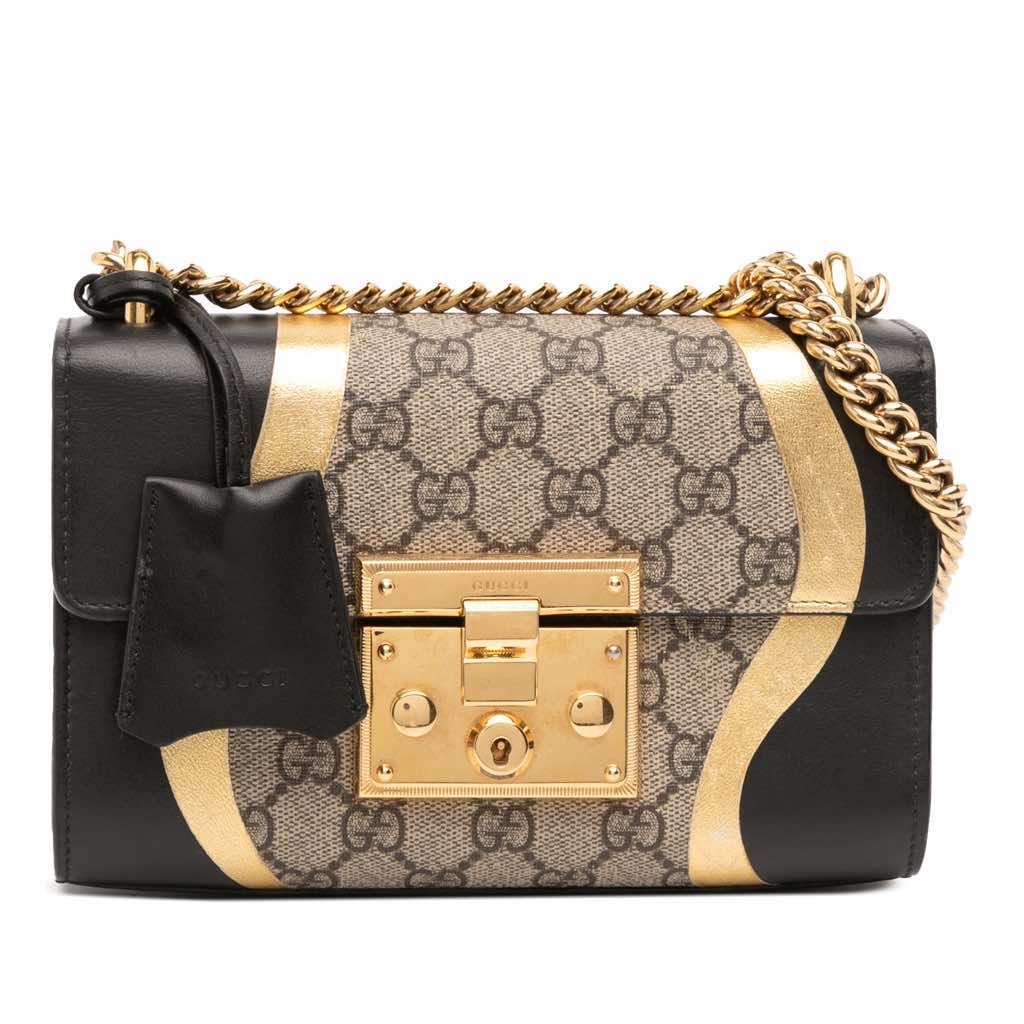 The Padlock crossbody bag features a coated canvas and leather body, a chain link strap, a front flap with a S-lock closure, and an interior slip pocket.