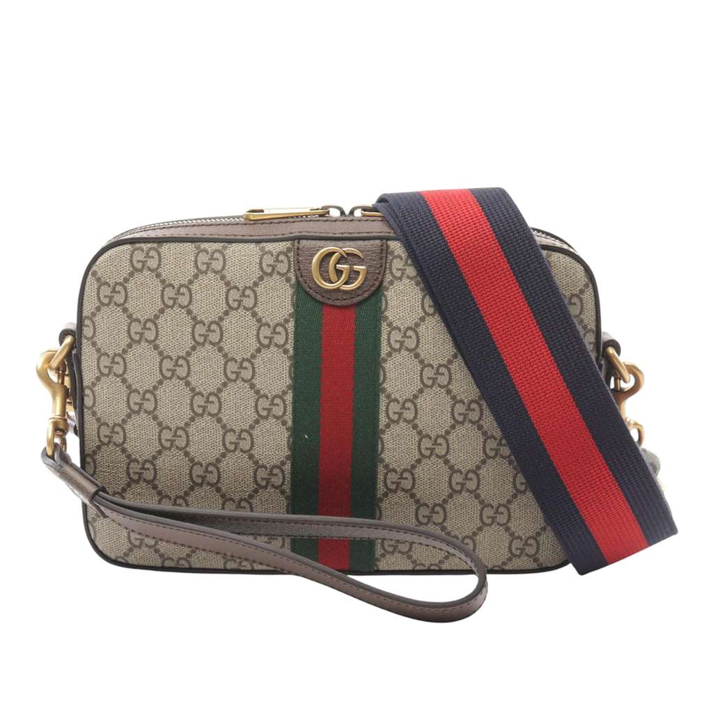 The Ophidia crossbody bag features a coated canvas body with leather trim, a flat leather wrist handle, an adjustable flat web strap, a top zip closure, and an interior zip pocket.