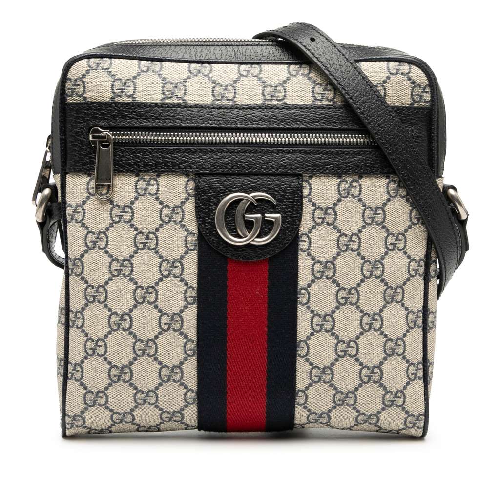 The Ophidia Crossbody Bag features a coated canvas body with leather trim, flat leather strap, exterior zip pocket, top zip closure, and interior zip and slip pockets.