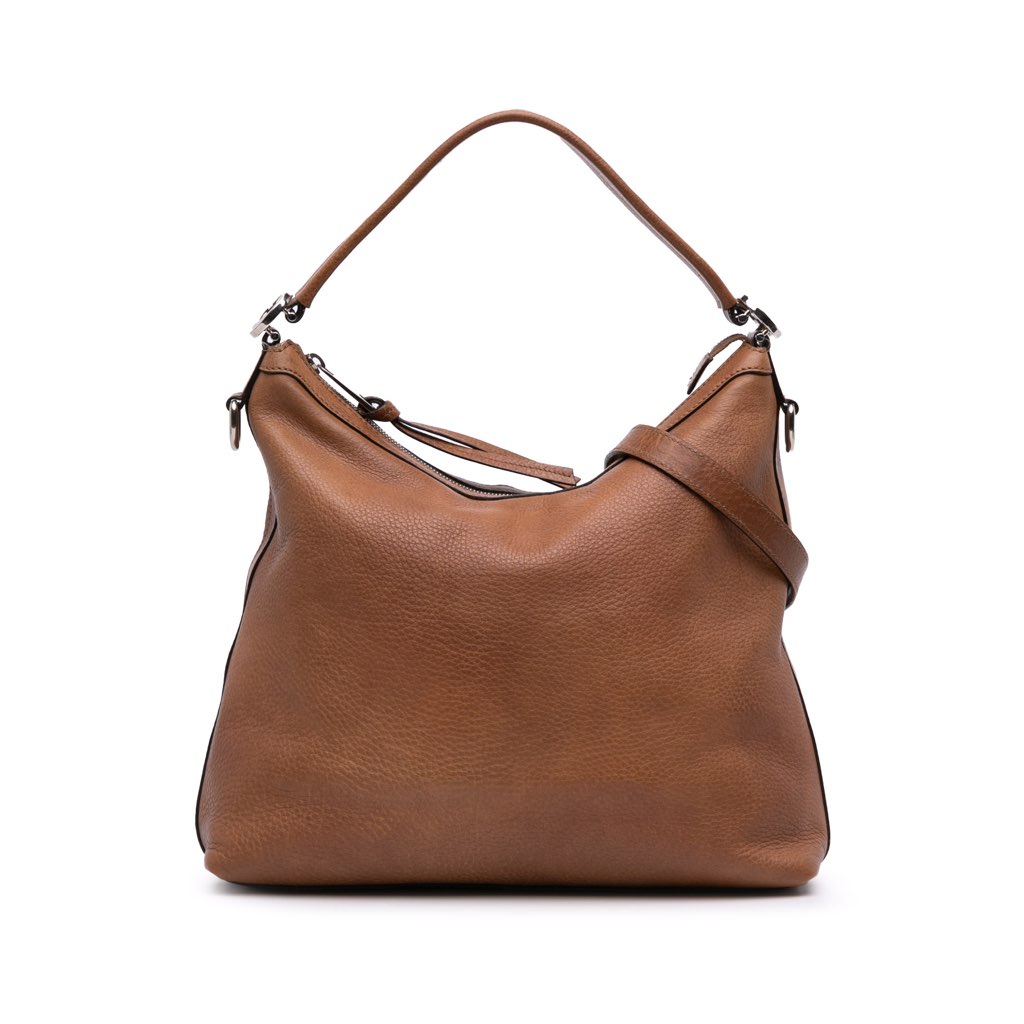 The Miss GG features a leather body, a flat leather handle, a detachable flat strap, a top zip closure, and interior zip and slip pockets.
