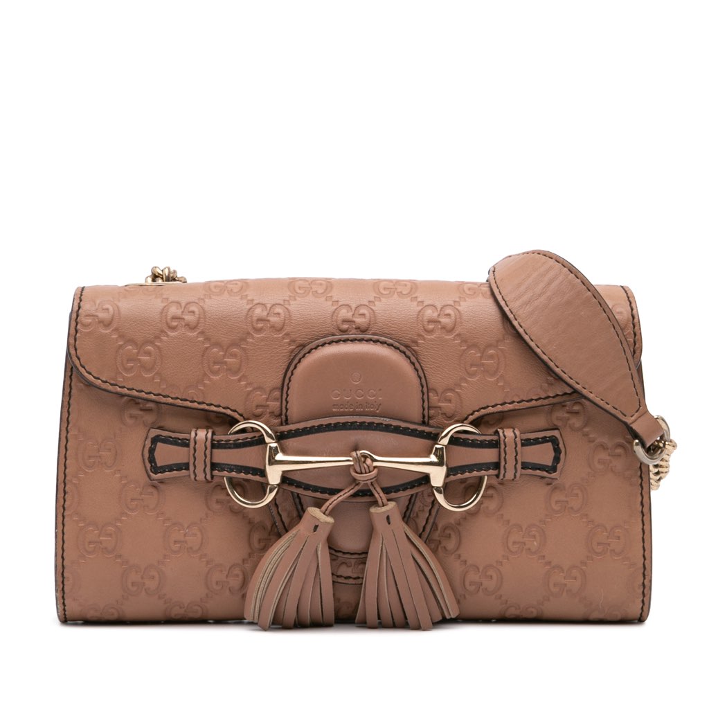 This crossbody bag features an embossed leather body, a curb chain link shoulder strap, a front flap with a tuck closure and a tassel and horsebit detail, and an interior slip pocket.