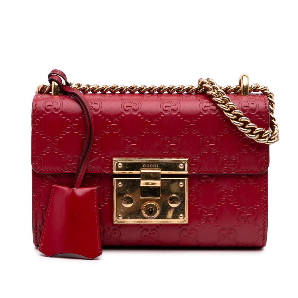 The Padlock crossbody bag features an embossed leather body, a chain link shoulder strap, a front flap with push lock closure, an exterior back slip pocket, and an interior slip pocket.