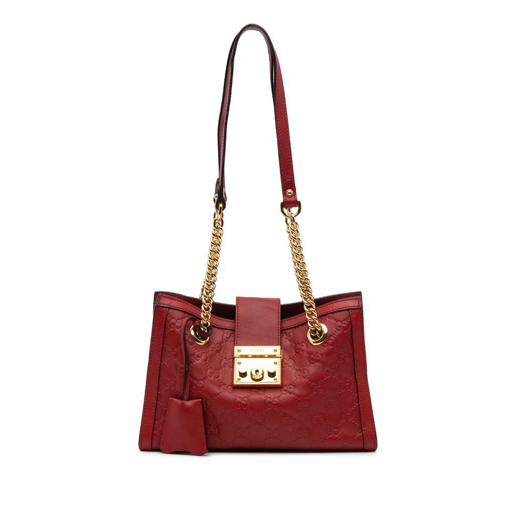 This tote bag features an embossed leather body, gold-tone chain link and leather straps, an open top flap with a strap and push-lock closure, and interior slip pockets.