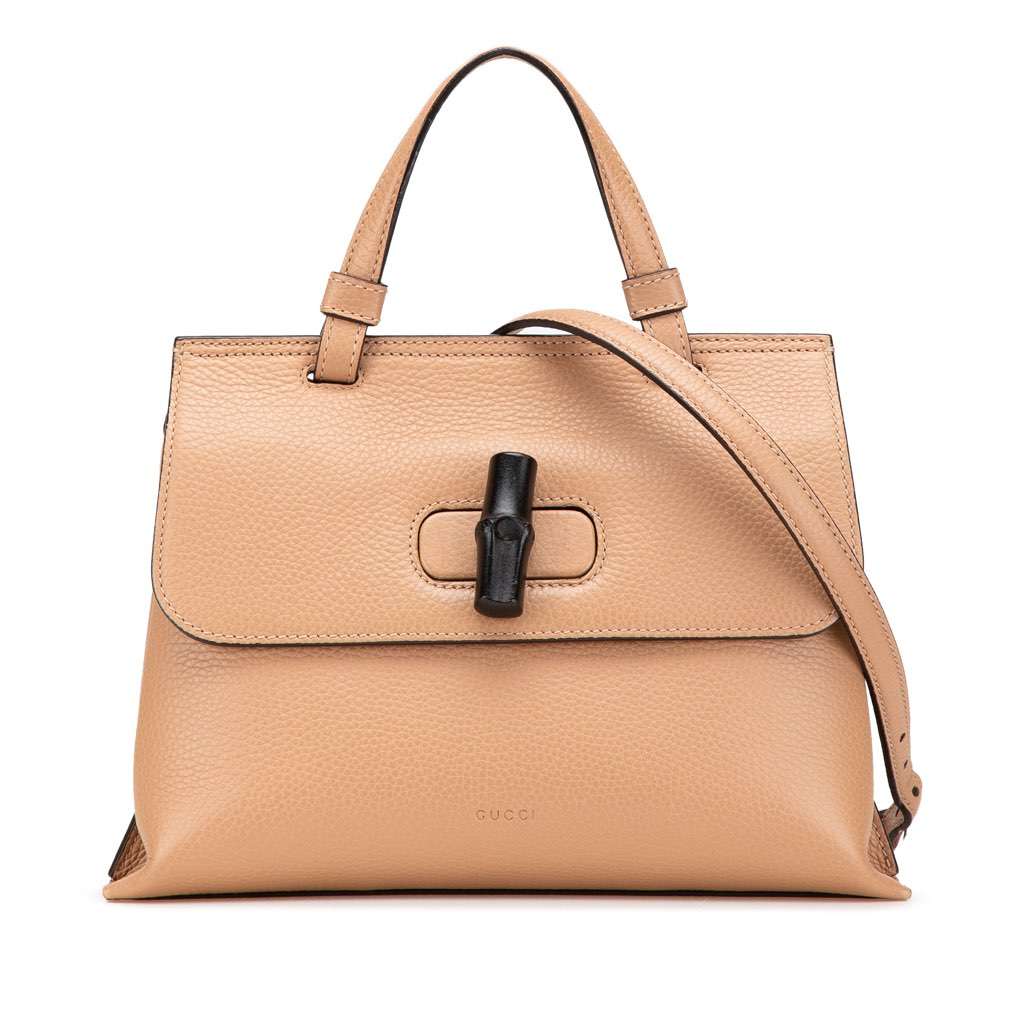 The Daily satchel features a leather body, a flat top handle, a detachable flat strap, a front flap with a bamboo twist lock closure, and interior zip and slip pockets.