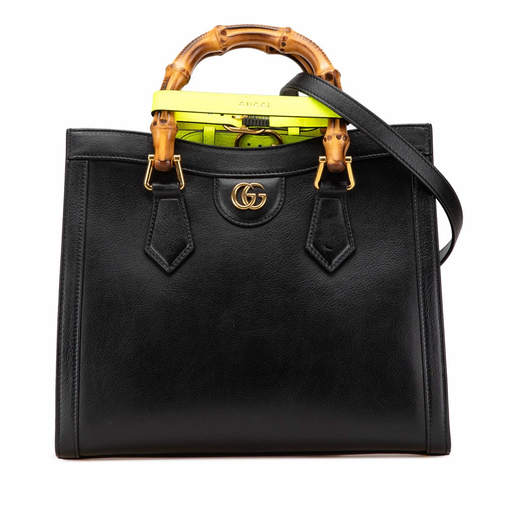 This satchel features a leather body, bamboo handles, a detachable flat leather strap, an open top with magnetic snap button closure, and an interior slip pocket.