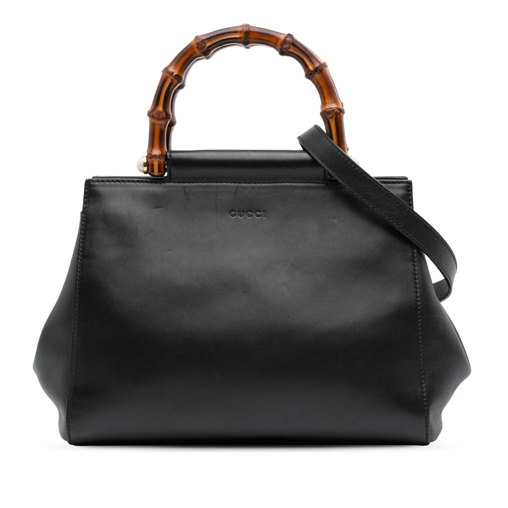 The Nymphaea features a leather body, bamboo handles, a flat leather strap, an open top with magnetic snap closure, and interior zip and slip pockets.