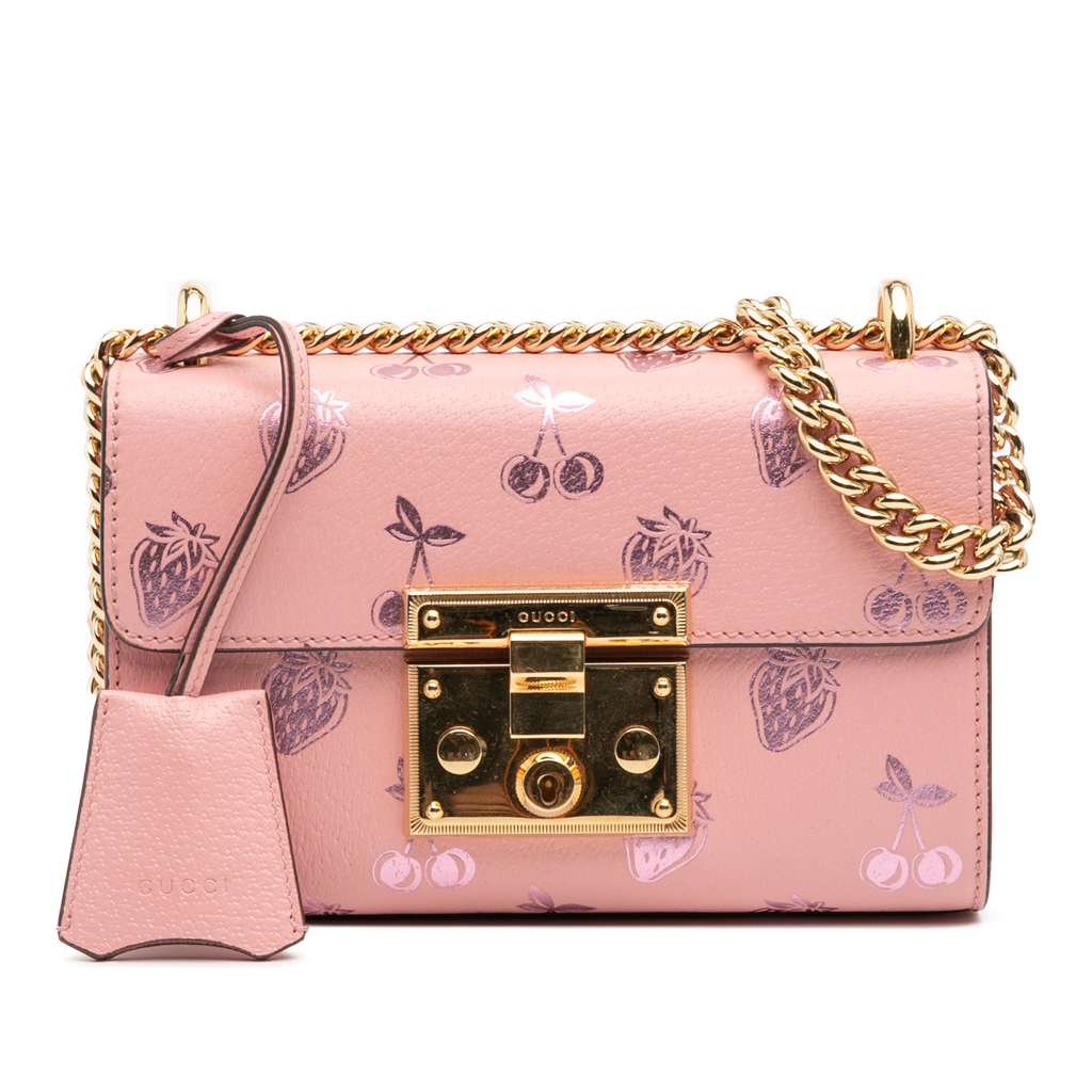 This crossbody bag features a printed leather body, a sliding curb chain link strap, a front flap with metal lock closure, an exterior back slip pocket, and an interior slip pocket.