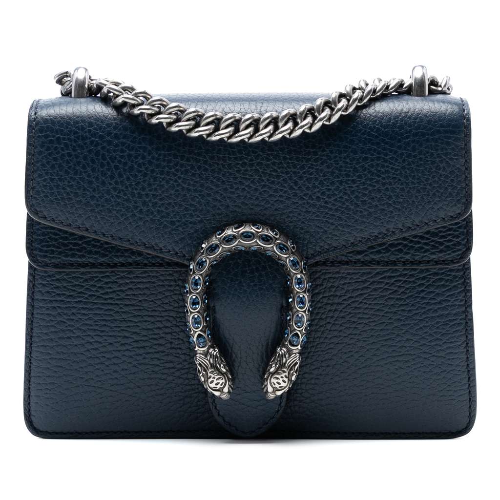 The Mini Dionysus features a leather body, a silver-toned chain link strap, and a front flap with a snap closure.
