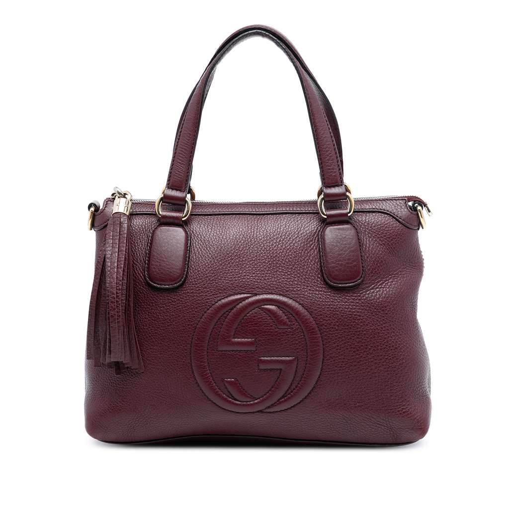 The Soho Working Satchel features a leather body, flat leather handles, a detachable strap, a top zip closure, and an interior slip pocket. The corners were repainted.