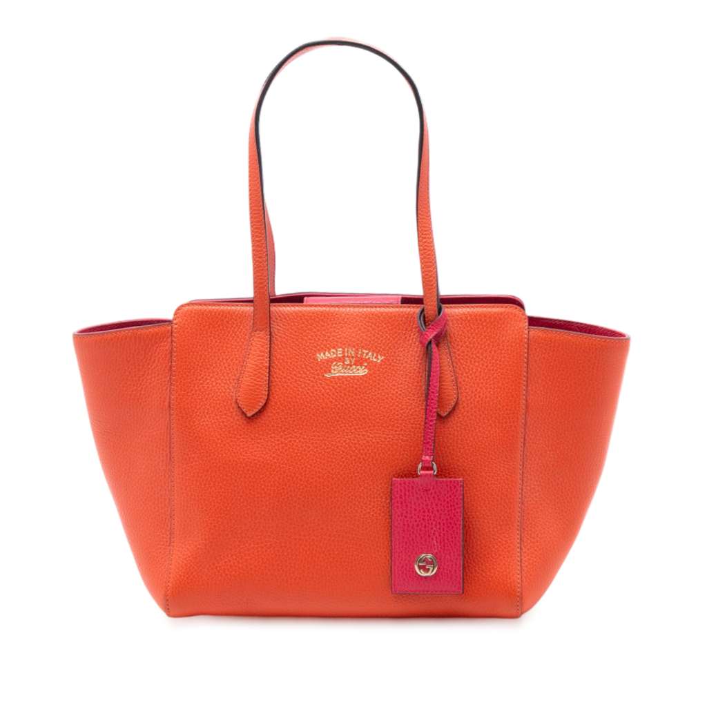 The Swing features a leather body, flat leather straps, an open top with magnetic closure, and interior zip and slip pockets.