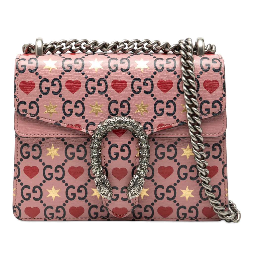The Dionysus features a printed leather body, a silver-toned chain link strap, a top flap with push-lock closure, and an interior zip compartment.