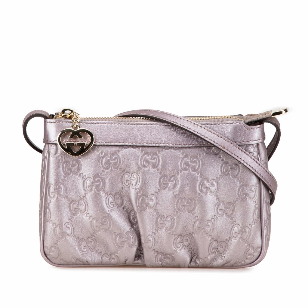 This crossbody bag features an embossed leather body, an adjustable flat leather strap, and a top zip closure.