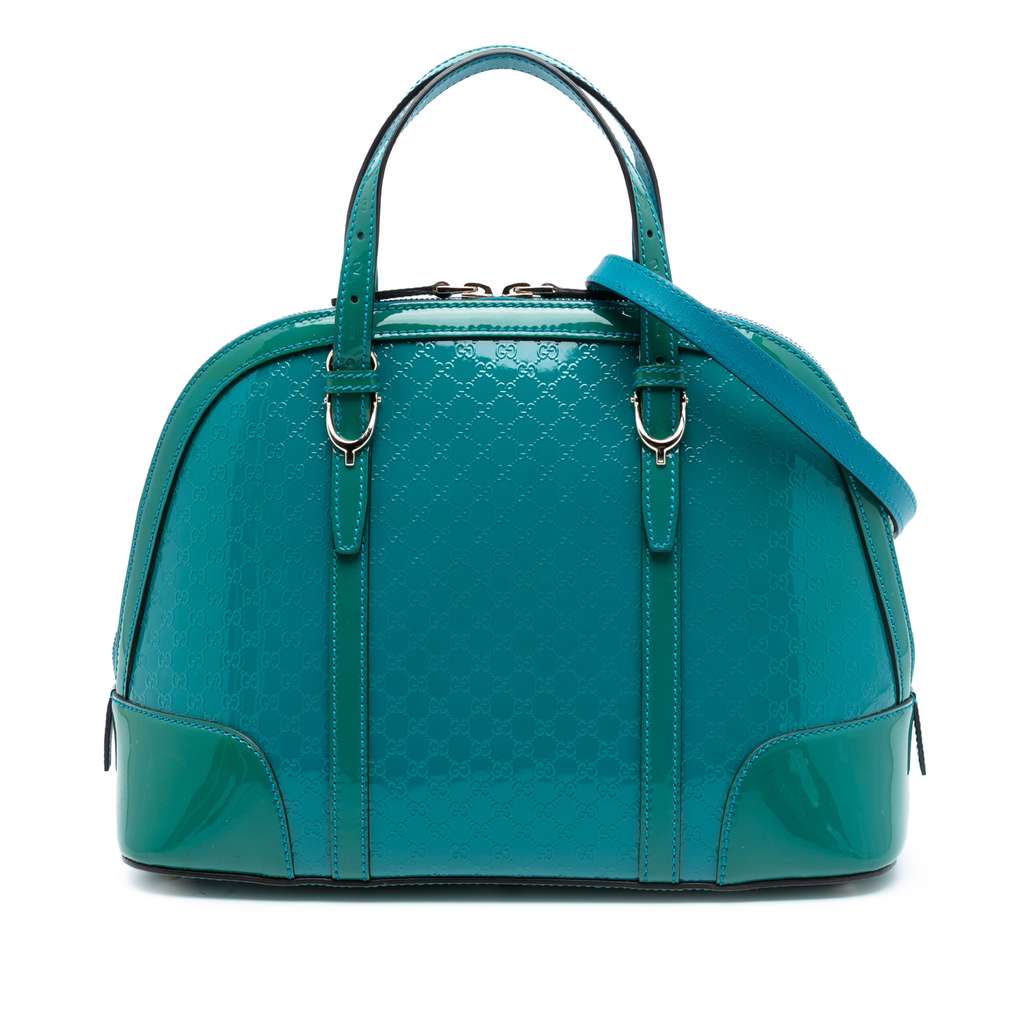 The Nice satchel features a patent leather body, flat leather handles, a detachable flat strap, a top zip closure, and interior slip and zip pockets.