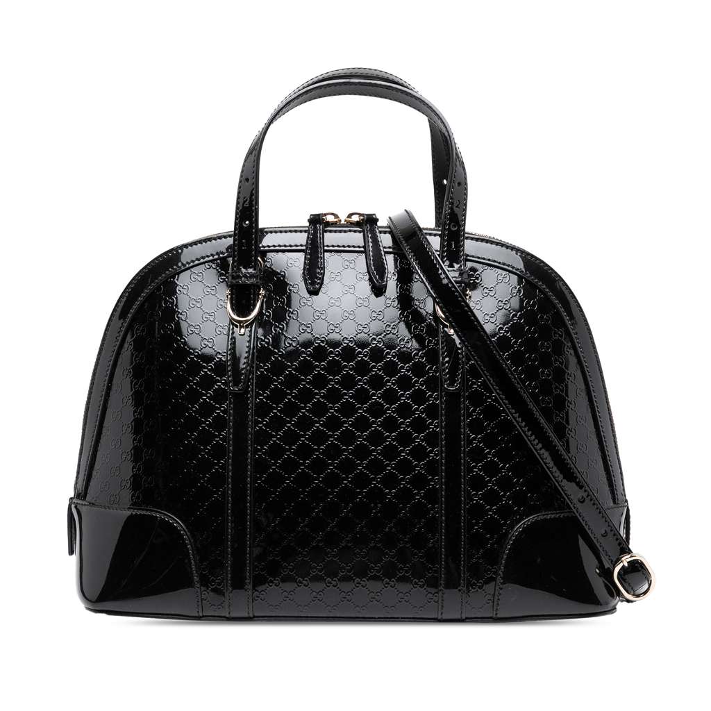 The Nice satchel features a patent leather body, flat leather handles, a detachable leather strap, a top zip closure, and interior slip and zip pockets.