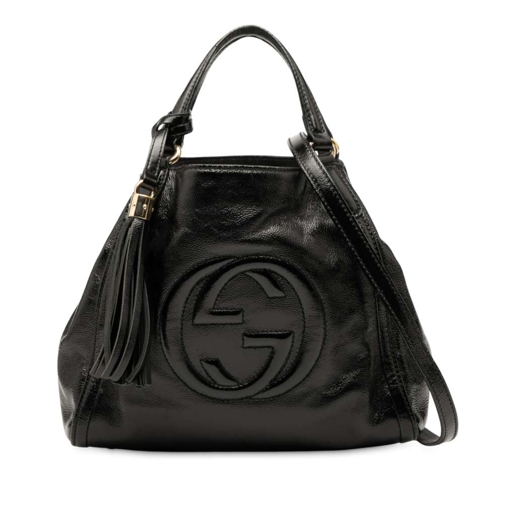The Soho features a patent leather body, flat leather handles with tassel details, a detachable flat strap, an open top with lobster claw closure, and interior zip and slip pockets.