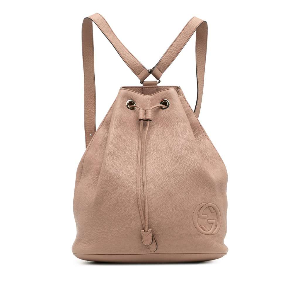 This backpack features a leather body, adjustable flat back straps, a drawstring closure, and interior zip and slip pockets.