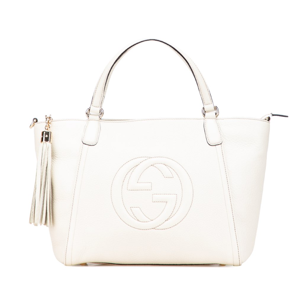 The Soho satchel features a leather body, flat leather handles, a detachable flat strap, a top zip closure with tassel details, and interior zip and slip pockets.