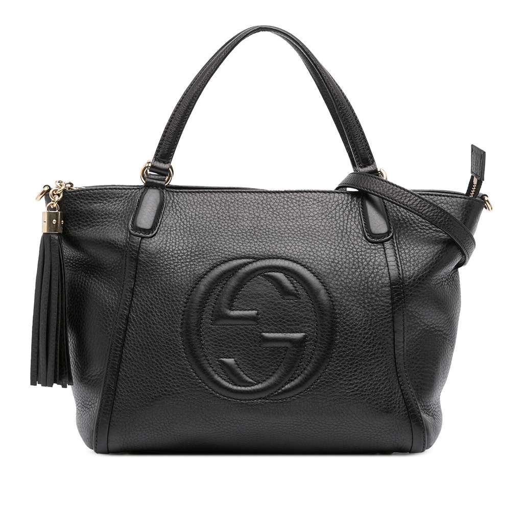 The Soho Cellarius satchel features a leather body, flat leather top handles, a detachable flat leather shoulder strap, a top zip closure with tassel details, and interior zip and slip pockets.
