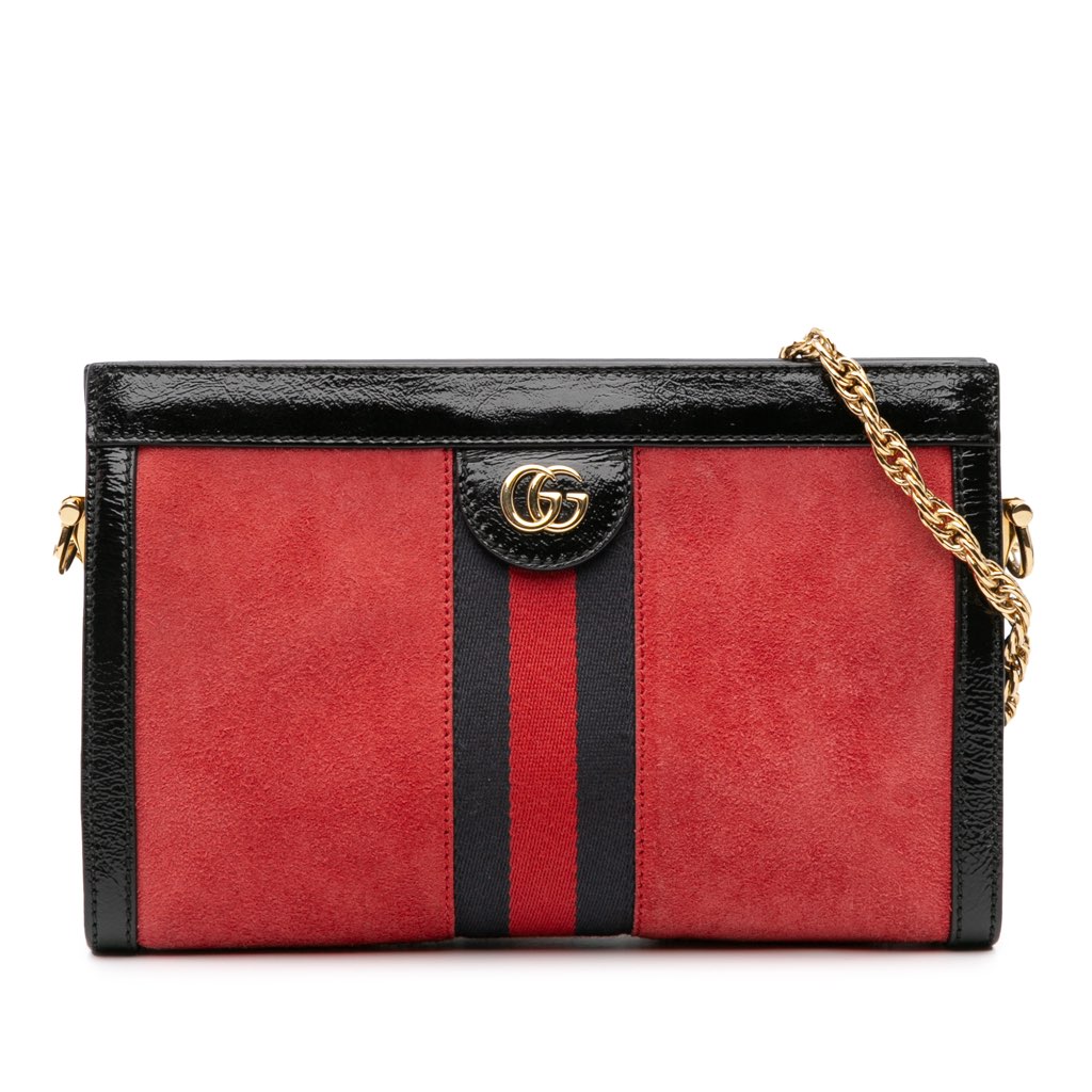 This crossbody bag features a suede body with leather trim, a gold-tone chain shoulder strap, magnetic top closures, and interior slip pockets.