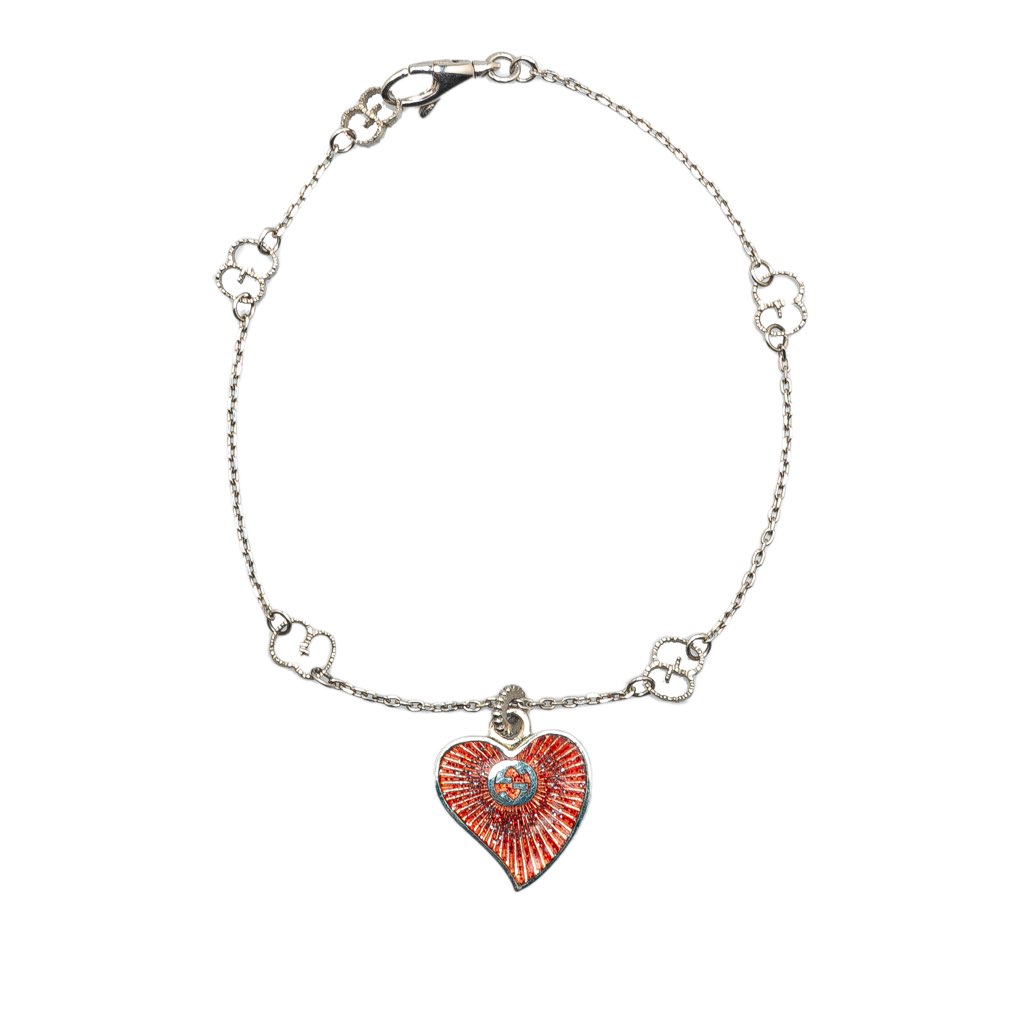 This bracelet features a sterling silver body, an enamel heart charm, and a lobster clasp closure.