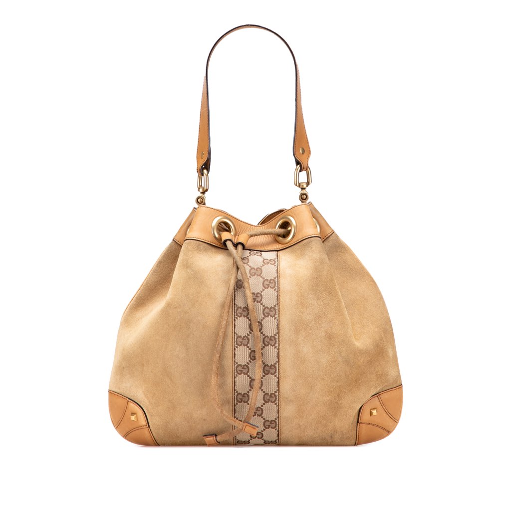 This hobo bag features a suede leather with canvas body, flat leather strap, top drawstring closure, and interior zip pocket.