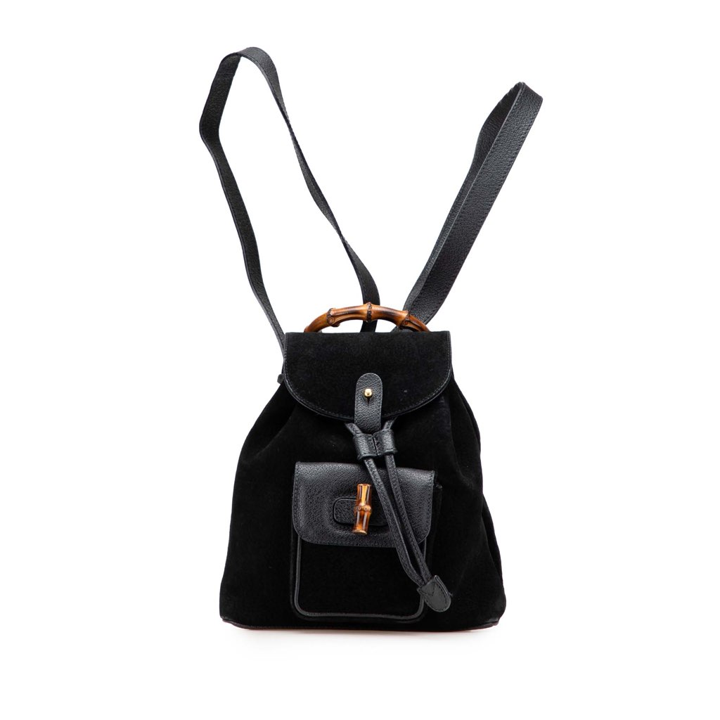 This backpack features a suede body with leather trim, flat leather back straps, a bamboo top handle, a top flap with buckle closure, drawstring closure, an exterior front flap pocket with bamboo twist lock closure, and an interior zip pocket.