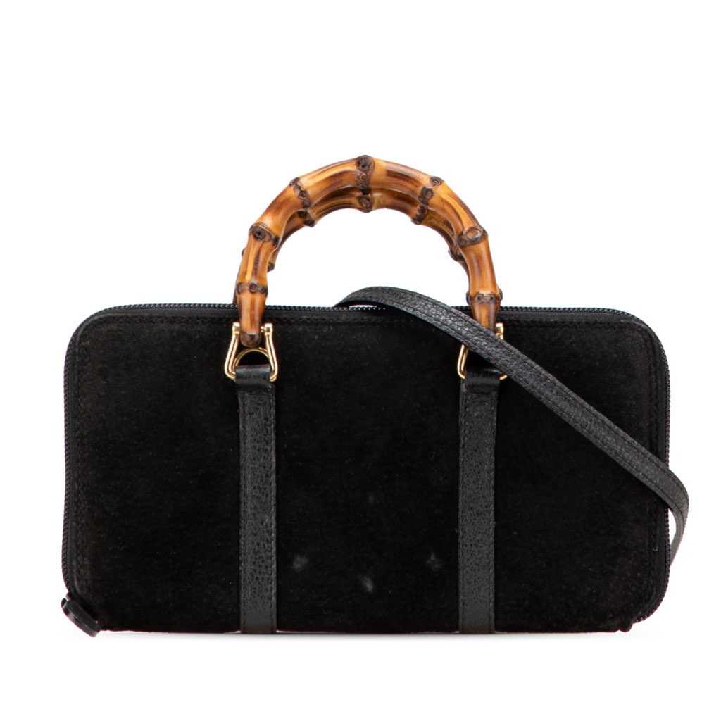 This satchel features a suede body with leather trim, bamboo top handles, a detachable flat leather strap, a zip around closure, and interior zip and slip pockets.