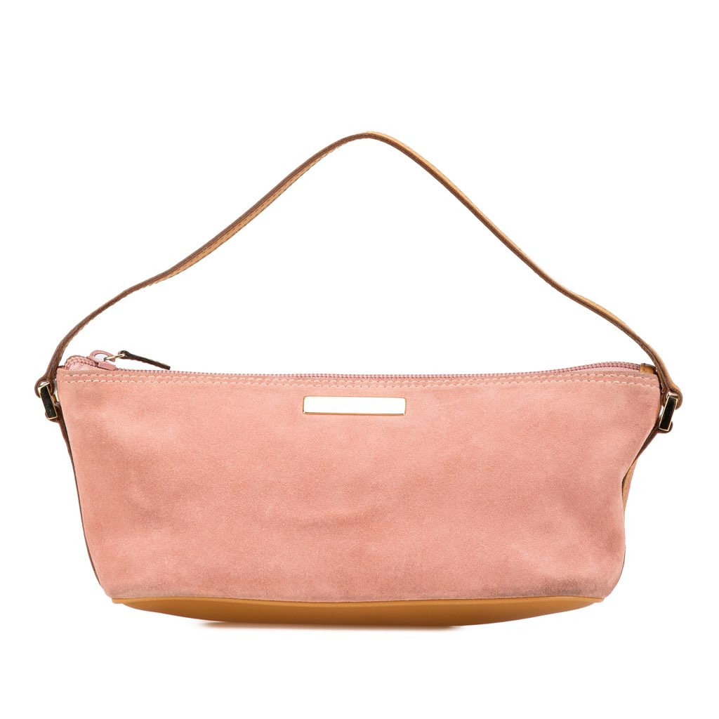 This shoulder bag features a suede body with calf leather trim, a flat leather strap, and a top zip closure.