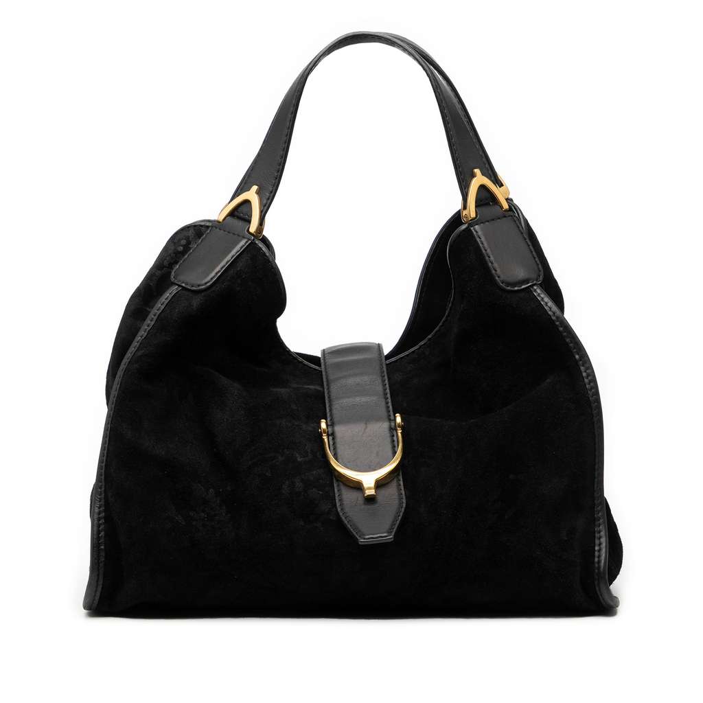 The Stirrup tote bag features a suede leather body with calf leather trim, flat leather straps, an open top with a front strap and buckle details, and interior zip and slip pockets.