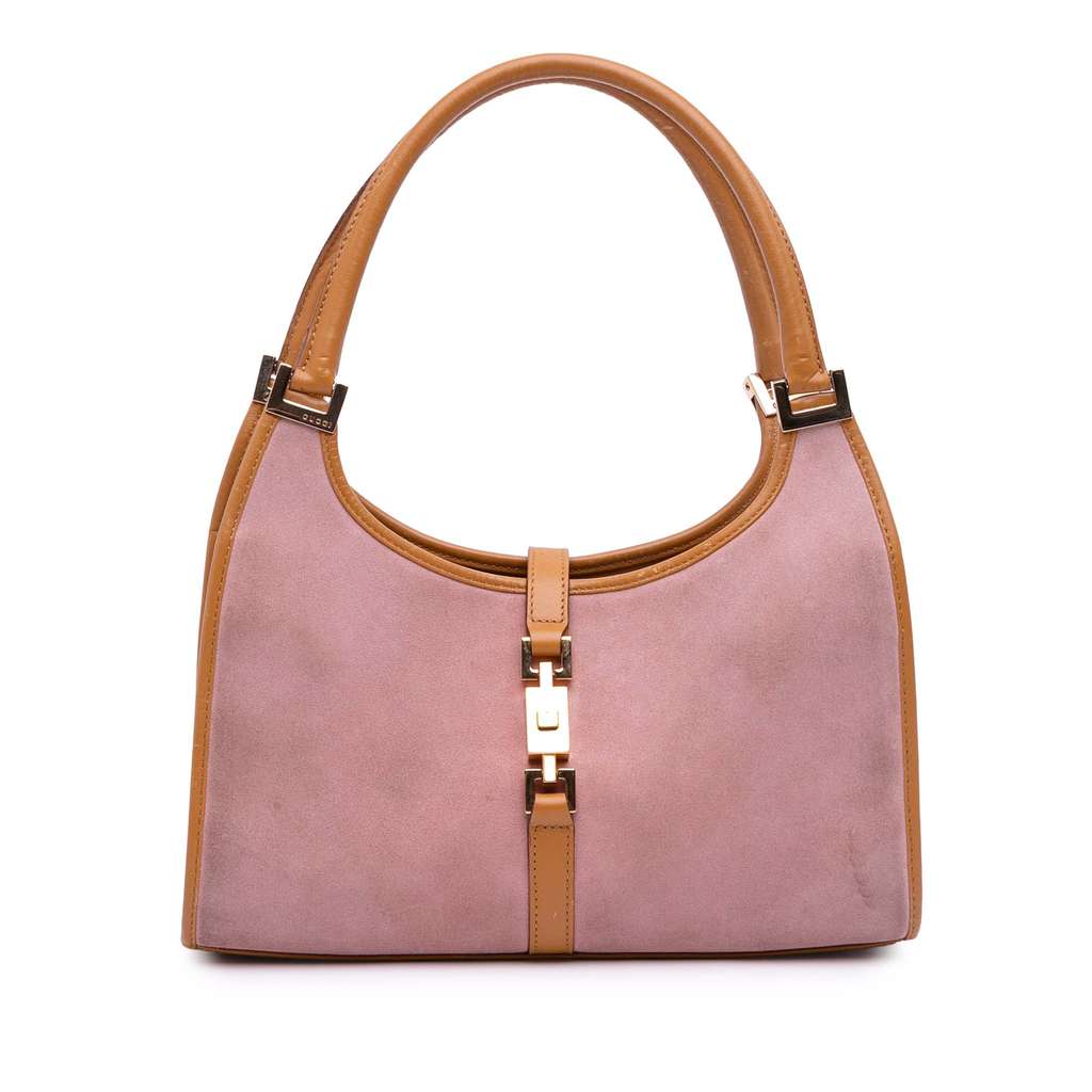 The Jackie shoulder bag features a suede leather body with leather trim, rolled leather handles, an open top with a flat strap and push lock closure, and an interior zip pocket.