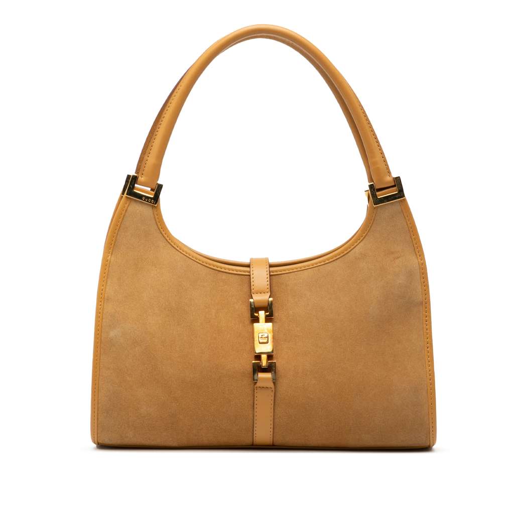 The Jackie features a suede body with leather trim, rolled leather handles, an open top with a flat strap and a push lock closure, and an interior zip pocket.