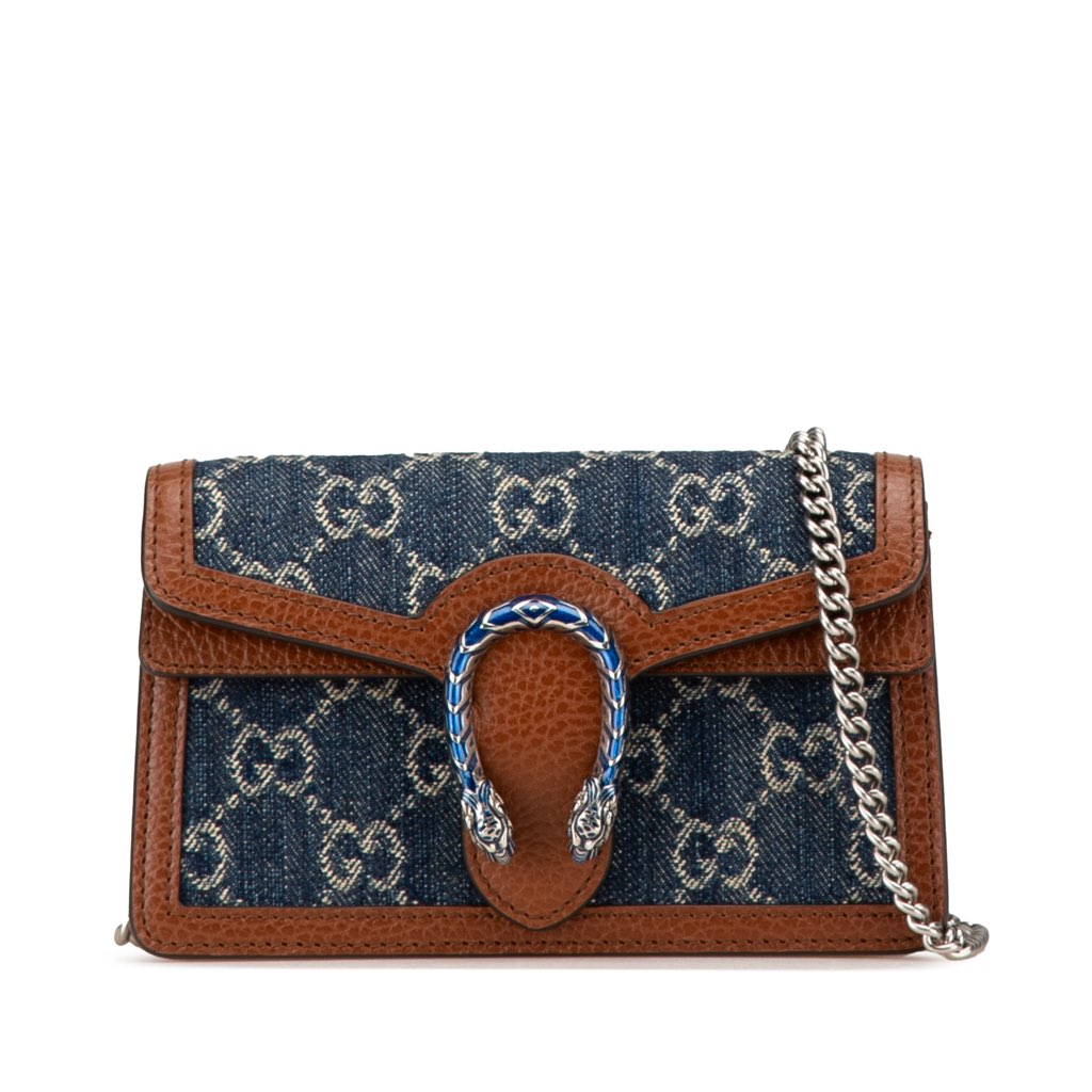 The Dionysus bag features a denim body with leather trim, a removable chain link shoulder strap, and a front flap with a snap button closure.