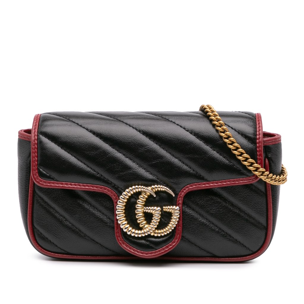 This crossbody bag features a quilted leather body, a chain shoulder strap, and a flap with snap button closure.