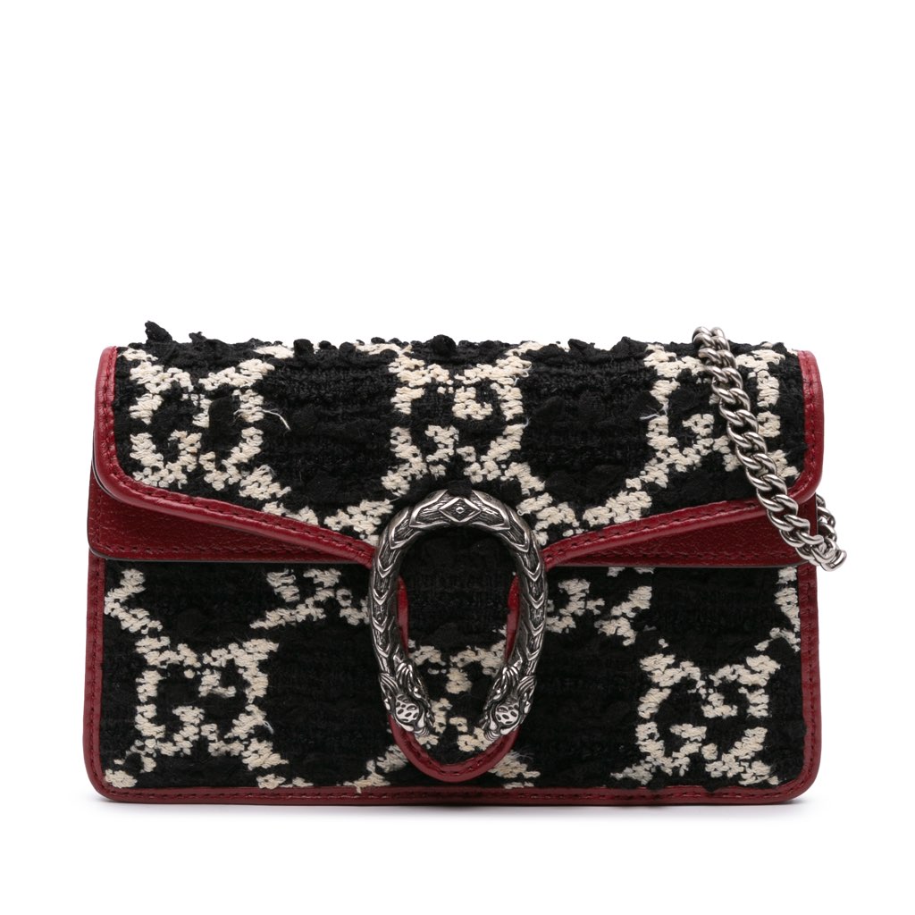 This Dionysus features a tweed body with leather trim, a chain link strap, and a top flap with push-lock closure.