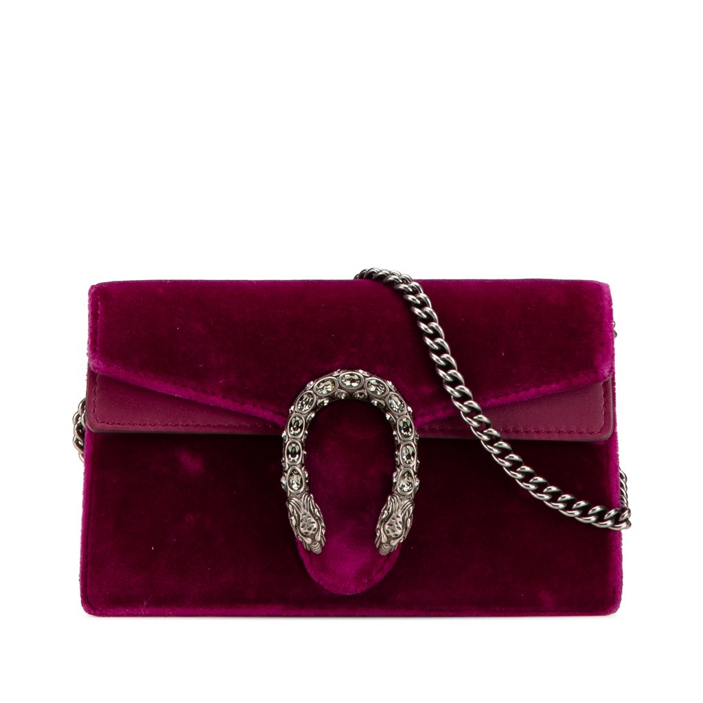 The Dionysus features a velvet body with leather trim, a silver-tone chain link strap, and a top flap with snap closure.