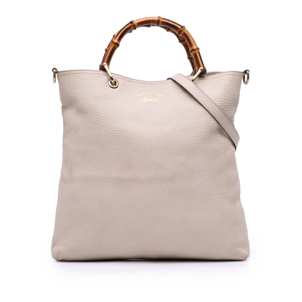 This satchel features a leather body, bamboo handles, an open top with a magnetic closure, and interior zip and slip pockets.