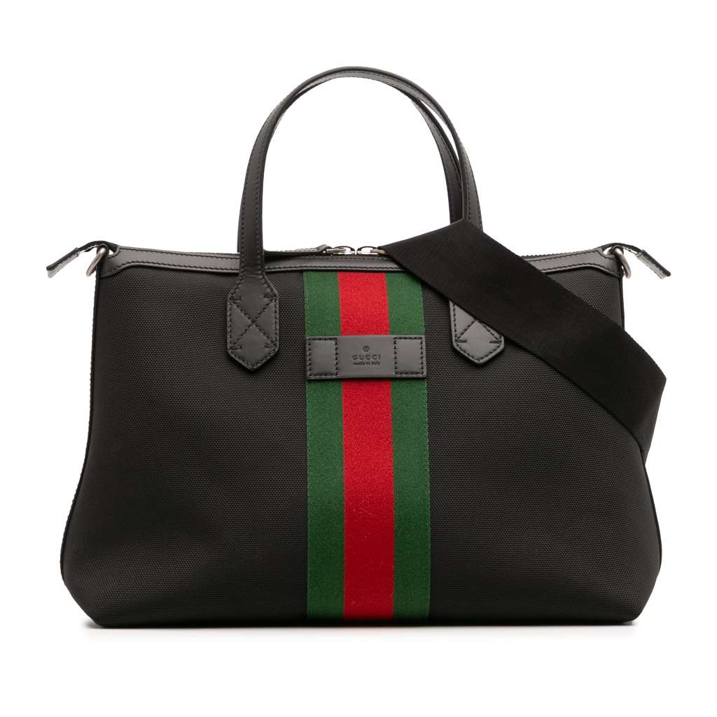 This satchel features a canvas body with web detail and leather trim, flat leather handles, an adjustable flat strap, a top zip closure, and interior zip and slip pockets.
