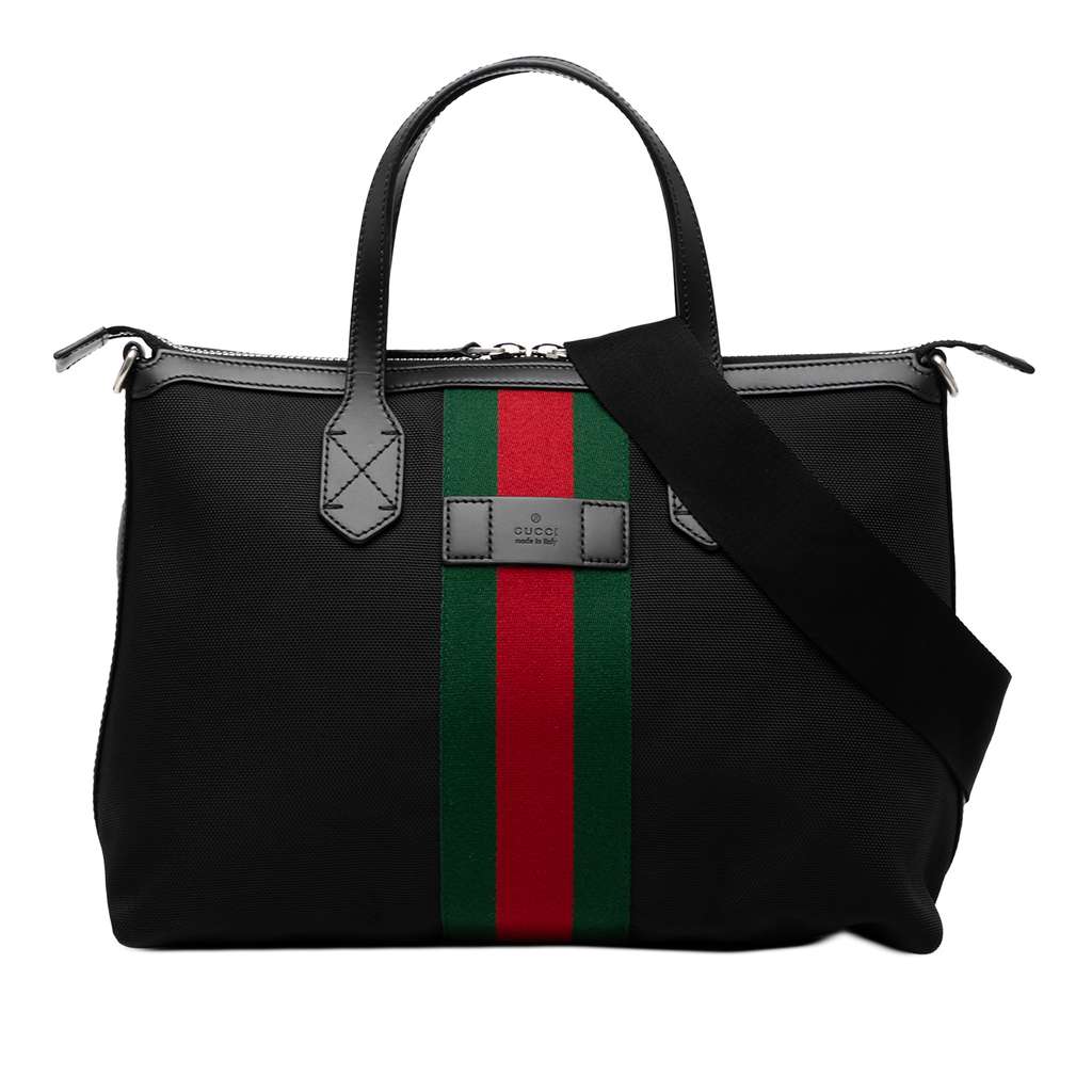 This satchel features a canvas body with web detail and leather trim, flat leather handles, an adjustable flat strap, a top zip closure, and interior zip and slip pockets.