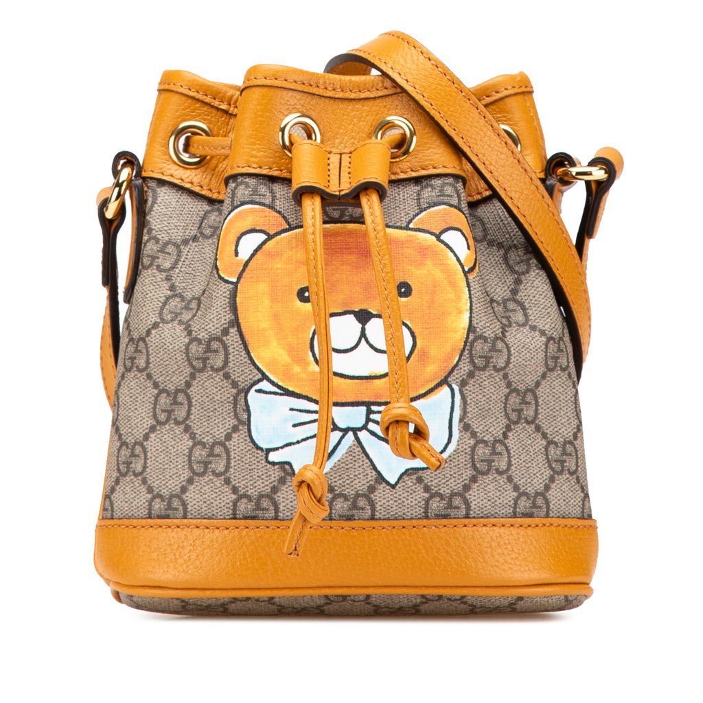 This bucket bag features a printed coated canvas body with leather trim, an adjustable flat leather strap, and a drawstring closure.