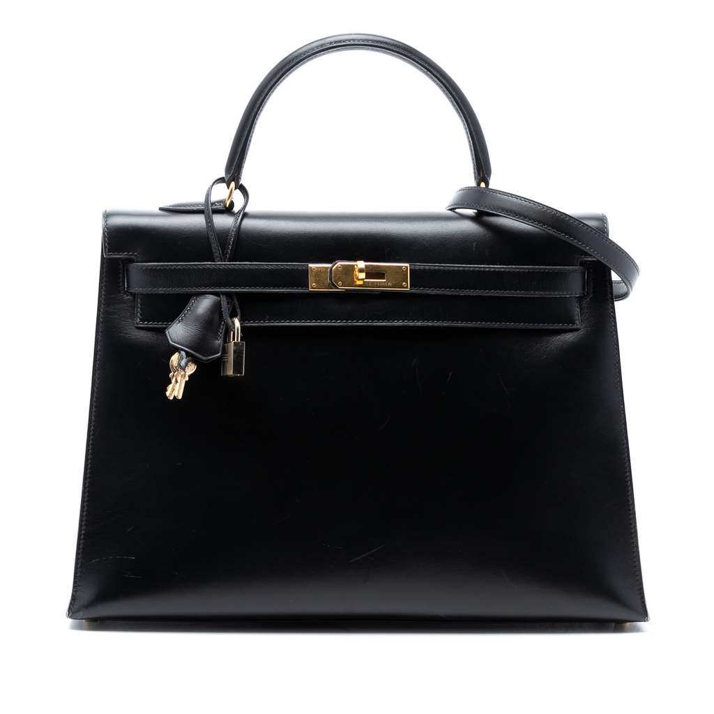This Kelly 35 features a Box Calf leather body in Noir color, a rolled leather top handle, a detachable flat leather shoulder strap, a flap with turn lock and pull-through closure, and interior zip and slip pockets.