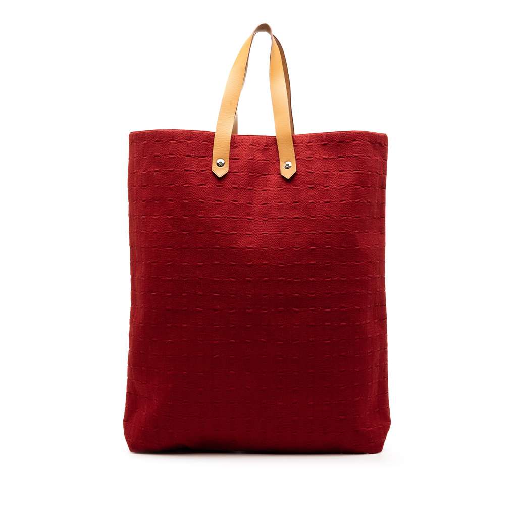 The Ahmedabad features a canvas body, flat leather handles, an open top, and an interior slip pocket.