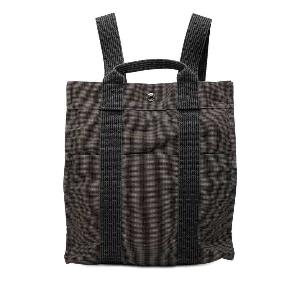 This backpack features a canvas body, a flat top handle, flat back straps, an open top with snap button closure, exterior front slip pockets, and an interior slip pocket.