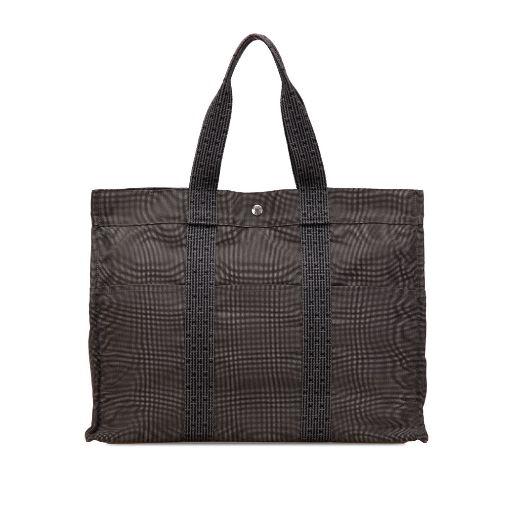 The Herline GM features a canvas body, flat straps, an open top with a snap closure, and an interior zip compartment.