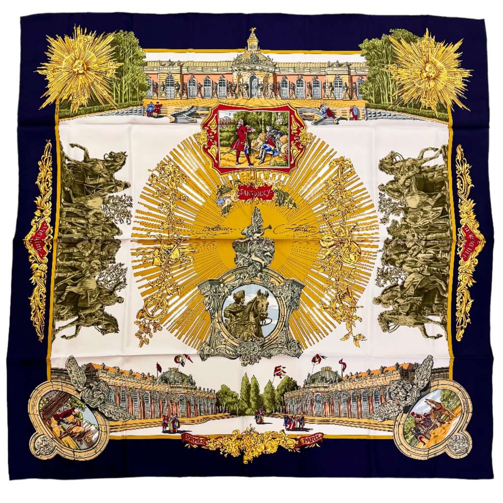 Details: authentic Hermès Carré 90 "Sanssoucy" 100% silk in navy blue: Dimension: 90 cm x 90 cm (Length x Width). Inclusion: no Hermes box. Item condiotion: Excellent; like new