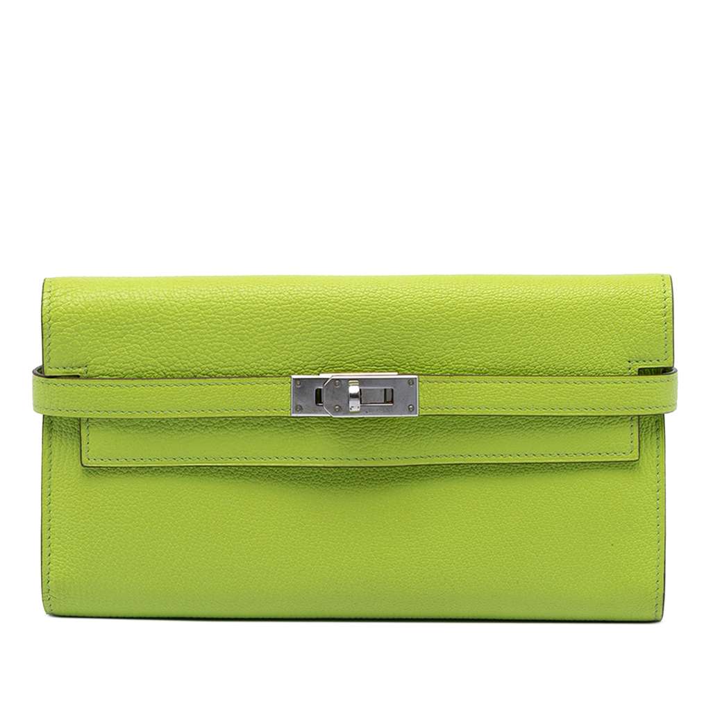 This Kelly wallet features an Epsom leather body in Kiwi color, a front flap with turn lock closure, and interior zip and slip pockets.