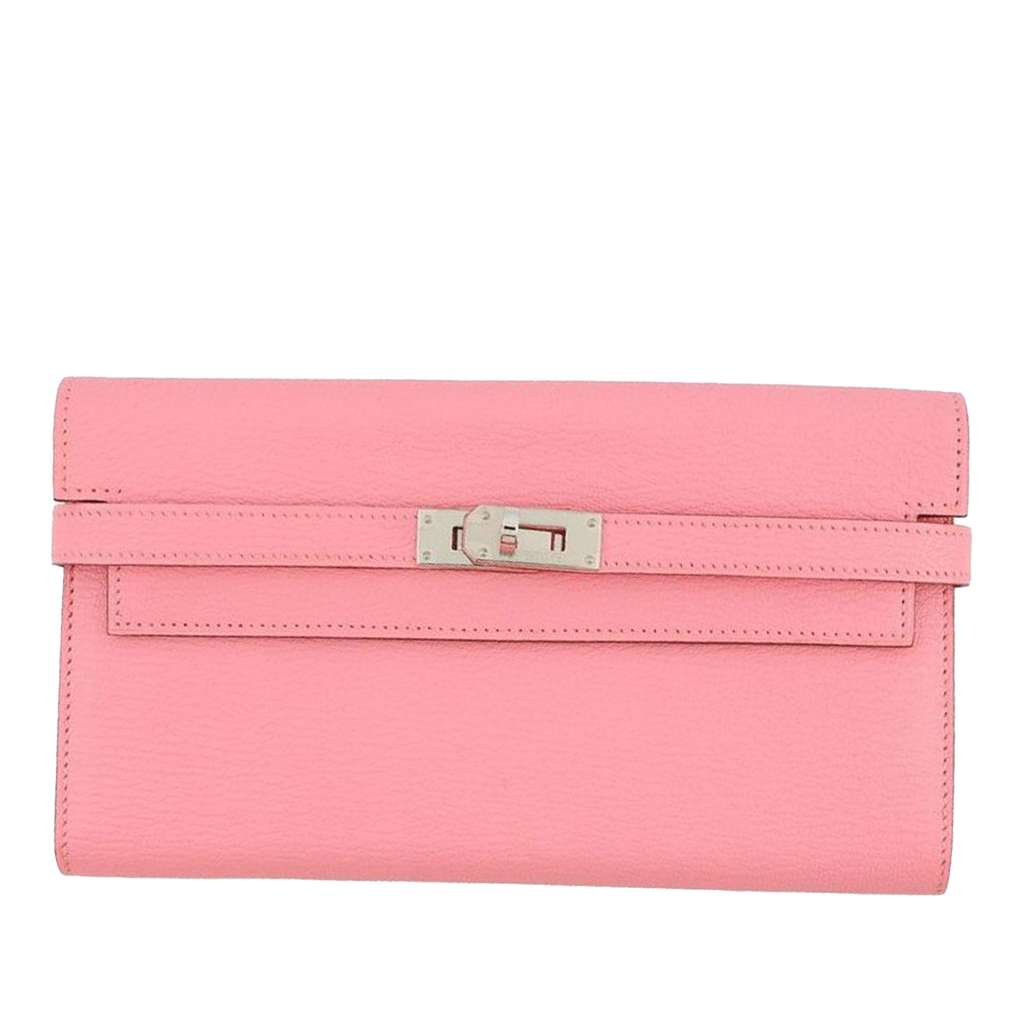 This Kelly To Go crossbody features a Chevre Mysore leather body in Rose Confetti color, a removable flat leather shoulder strap, a front flap with turn-lock closure, and interior zip and slip pockets.