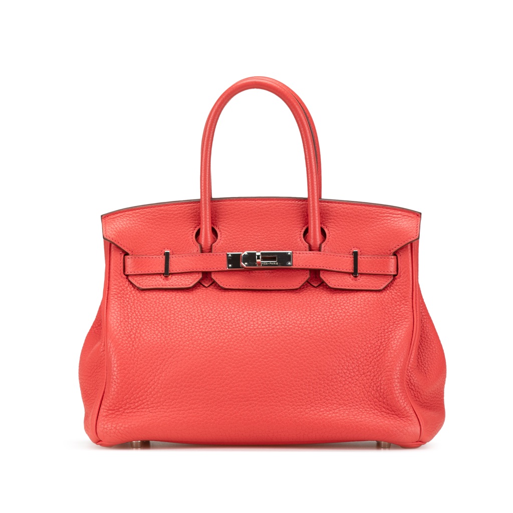 The Birkin 30 features a Clemence leather body in Bougainvillea color, rolled leather handles, a front flap with turn-lock closure, and interior slip and zip pockets.