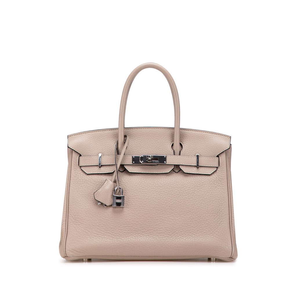 This Birkin 30 features a Clemence leather body in Argile color, rolled leather handles, a front flap with a strap and turn lock closure, and interior zip and slip pockets.