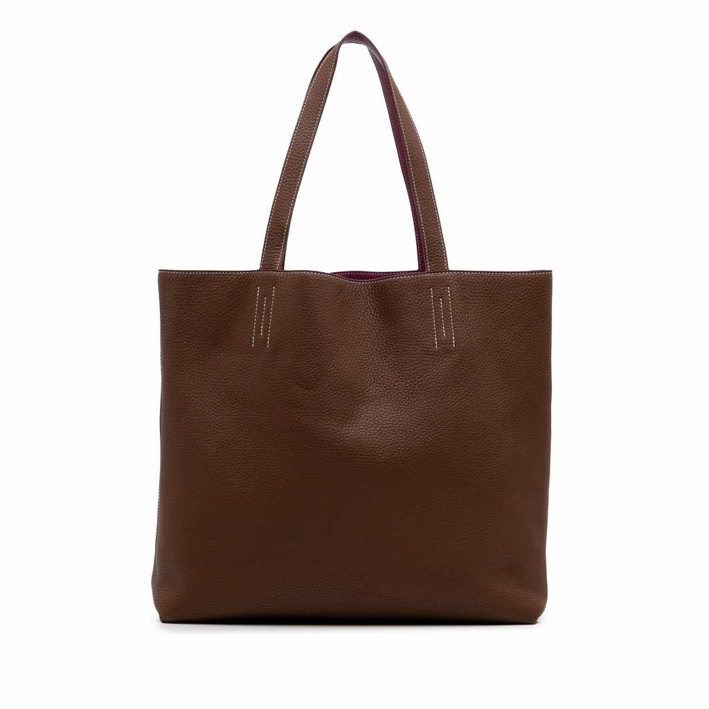 This Double Sens features a clemence leather body, flat handles, and an open top.