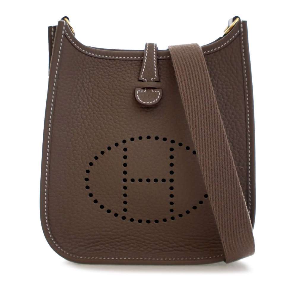 This Evelyne TPM features a Clemence leather body in Etoupe color, a detachable flat canvas strap, and an open top with a strap and snap closure.